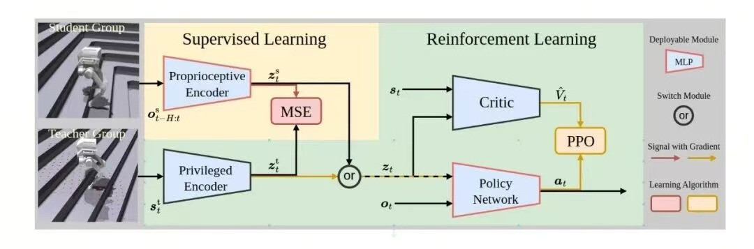 In the paper “CTS: Concurrent Teacher-Student Reinforcement Learning for Legged Locomotion”, the authors and Limo Dynamics introduced an innovative approach aimed at enhancing legged robots’ locomotion performance on complex terrain. Traditional teacher-student RL frameworks adopt a two-stage pipeline: reinforcement learning is first used to train a teacher policy with privileged information (terrain, contact force, etc.), and then supervised learning distills knowledge into a student policy trained only on proprioceptive data.