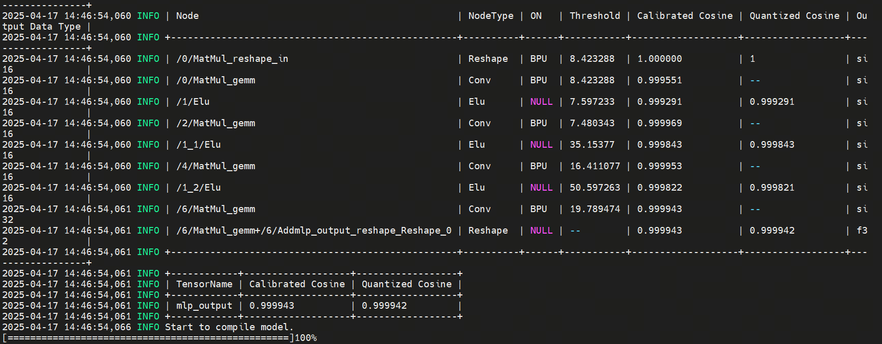 Refer to the bottom 2 × 3 table. It shows the cosine similarity between the final mlp_output and CPU output. All cosine similarity values exceed 0.9999, confirming extremely high accuracy retention.