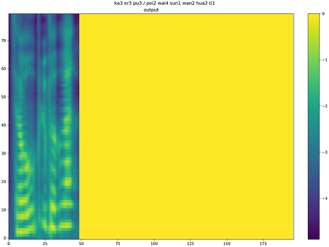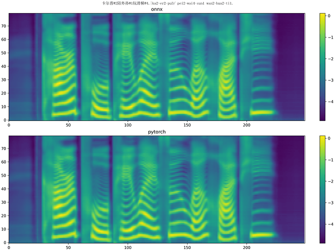 Since the converted model does not carry out any additional optimization, the accuracy loss is relatively serious at present. The two images below are a composite of the same sentence: “Culp plays on the slide with his grandson.” The top half of the first figure is the synthesis result of the pytorch model after ONNX conversion, and the bottom half is the synthesis result of the original pytorch model, which shows little difference. The second picture shows the composite effect of the model after loading the board. It can be seen that the accuracy loss of the quantized model is very serious, and the length of the Mehr spectrum generated by the final generated model is very different from that generated by the model before conversion (more than 50 frames and more than 200 frames), and the content generation of the Mehr spectrum is also poor. At this point, various optimizations are needed to truly achieve high-quality speech synthesis.